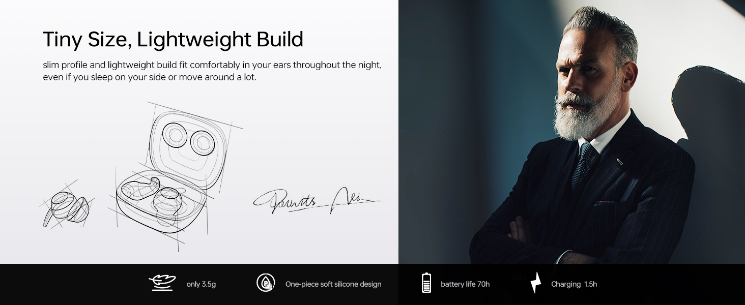 【Bluetooth 5.4】Stable Bluetooth 5.4 connection for seamless playback of your favorite sleep music with enhanced bass design for balanced and gentle sound quality creating a perfect sleep environment. Provides up to 5 hours of battery life on a single charge extendable to 70 hours with the charging case.