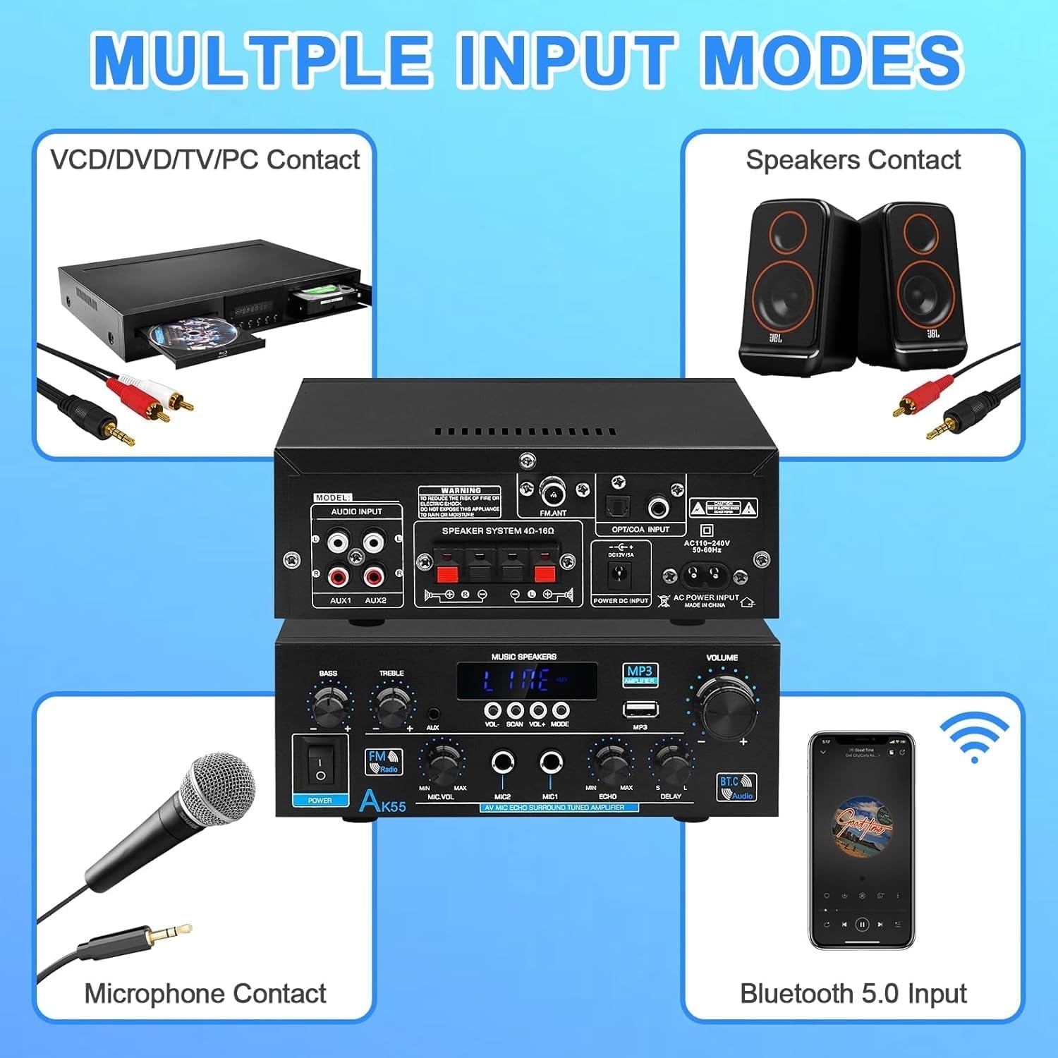 AK55 Amplifier Home Audio Stereo Receiver with Bluetooth 5.0 Rated Power 70W X2 Mini AMP 2.0 Channel HiFi Stereo Amplifier for Home Theater Audio System Studio Karaoke W/Bass/Treble/AUX/FM/MIC/USBName: HiFi Power AmplifierBrand: WoopkerModel: AK55Audio Channel: 2.0Rated Power: 70W+70WMax Output: 600WBluetooth: 5.0Voltage: AC 100~240V or DC 12V/5ABattery for Remote: CR2025 x1(Not Included)Gross Weight: Appx 1.1kg/2.43lbSize: Appx 199x188x69mm/7.83x7.4x2.72inS/N Ratio: 85dbDistortion rate: ≤0.5%Rated Frequency: 20-20KHzFeature1: Treble/Bass/MIC Vol AdjustableFeature2: Echo/Delay AdjustableInput Option: BT/USB/RCA/AUX/MIC/OPT/COAOutput Option: Wired Passive SpeakerSpeaker Impedance: 4-16 ohmsMax. Capacity of U-disk: 64GU-disk File Format: MP3/WMA/APE/FLAC/WAVPackage:1X Audio Amplifier1X Power Cable1X User Manual 1X Remote ControlAttention: Due to product packaging and shipping requirements the included remote control does not include batteries. Please be aware