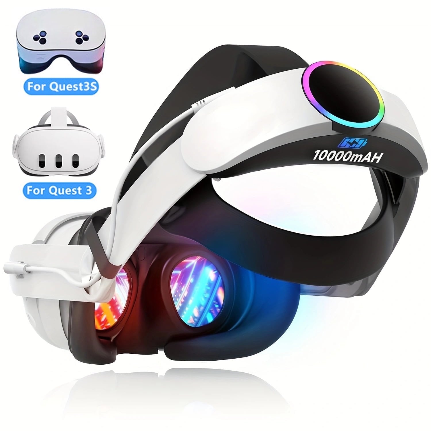Package Included: 1 x Head Strap with BatterySpecification:Compatible with Oculus Quest 3/Oculus Quest 3SAverage Battery Usage: 5-7 HoursBattery Capacity: 10000mAhCharging Time: 4-5 hours (fully charged)Material: ABS+PC+PUPower Supply: USBFeature: Adjustable Headband Quick ChargeAdjustable Size: The rear adjustment knob can be used to increase or decrease the length of the side straps allowing for an adjustment range of 17 to 27 inches and improving the support and comfort of the device.Description:【Elite Strap with 10000mAh Battery】For Oculus Quest 3/Quest 3S Head Strap features a high-capacity 10000mAh battery. adding about 2-4 hours (APP depends) of VR time. Full battery head strap can extended use to 4-7 hours.【Upgraded 18W Fast Charging】 According to our test low power charging solution is hard to support the need of charging while using. So we use the high cost fast charging to allow the VR headset to be powered in time even when the battery is low.Fast-charging solutions save your battery life.【 Enhanced VR Experience】 The ergonomic design of the headband is well balanced and greatly reduces the stress on the face during prolonged use. Adjustable components ensure stability and prevent light leakage and slippage during play you can immerse yourself in the world of VR to your heart's content【Durable and Comfortable Material】This VR headstrap shell and side straps part is made of reinforced ABS material the side straps have been tested with 10000+ bends.The back support part is made of high quality soft rubber very comfortable and fit the back of most people's head. The top straps are made up of soft PU leather and protein cotton composite to provide better cushioning stretch and reduce frontal weight.【Safety and Reliability】As it is a built-in battery we pay great attention to safety and stability. We designed this head strap with overheat protection overcurrent protection overvoltage protection and overcharge protection for the battery. You can wear it with complete peace of mind to experience your VR games!【Foldable and Adjustable】The head strap for Quest 3/Quest 3S can be adjusted up or down on the side straps so you can quickly switch between virtual and real life without removing the headband. The front and back adjustments of the head strap fit everyone's head size making it perfect for you and your family.