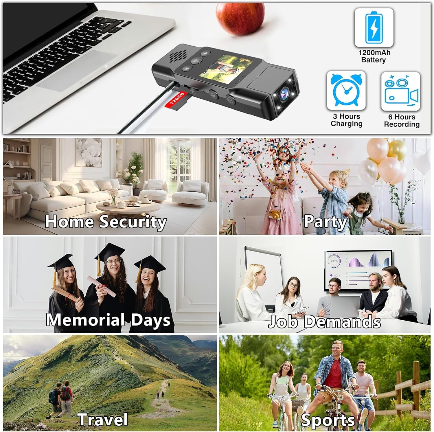 【3-in-1 Multi-function】This body mounted camera has not only video recording but also audio recording and photo shooting effortlessly carry and quickly use it to record memorable videos to take beautiful pictures and to keep the pure sounds. It has a 1.3” LCD screen to clearly show recording details 2 bright fill lights for night vision large 1200mAh battery to achieve 5-hours continuous video recording/12-hours audio recording included 64G Micro SD card to save files and you can directly playback these files in the camera without the trouble to use PC.