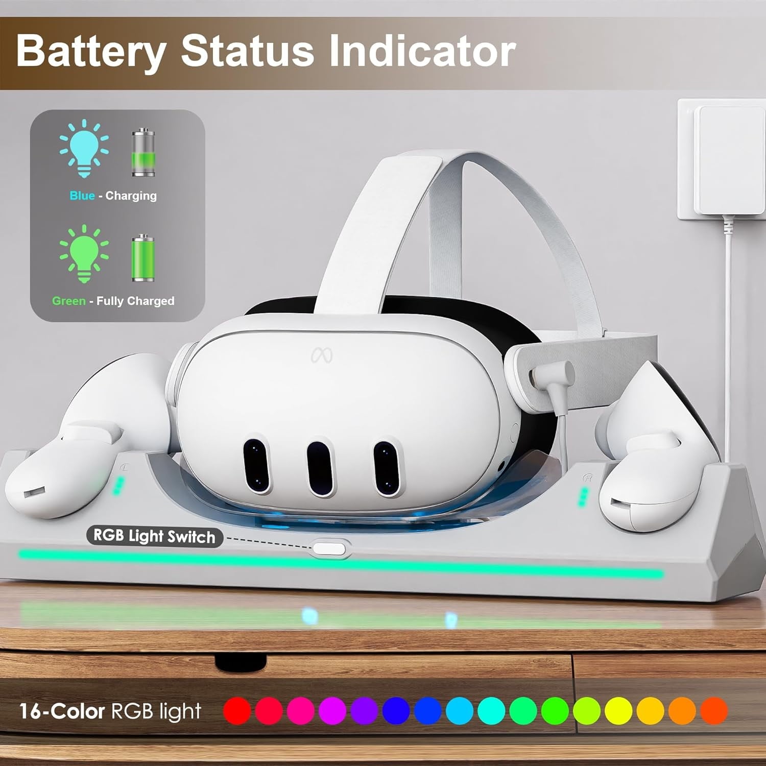 【Aesthetic LED Indicators】 The quest 3 charger is equipped with atmosphere charging indicators. A good chioce for your Oculus quest 3 accessories. Easily distinguish charging status. Red indicates charging and blue indicates fully charged. The light can be turned off when not necessary.