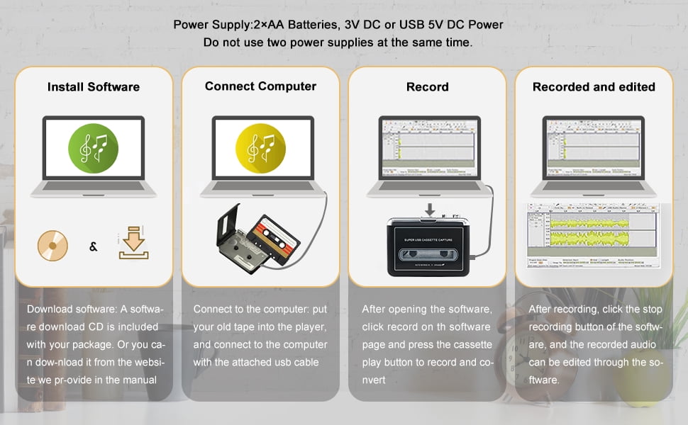 【Audacity software】Our cassette player can compatible with Windows XP Vista and Windows 7 mac older than version 10.5. By transferring your cassettes to MP3s in a quiet room you can enjoy crystal clear sound quality with even the oldest bands.