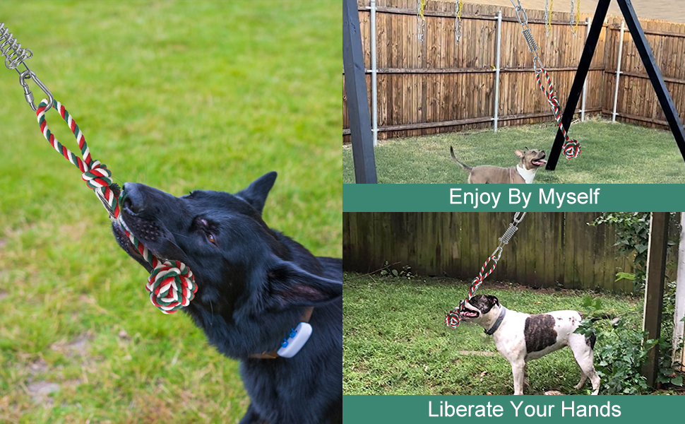 🎄🎁【SOLO PLAY】Life gets busy. we don't have time and energy to accompany our dog to play games together. The tether dog tug toy attracts the dog's chase in the shaking and swing. Pulling and tugging make them endlessly busy which can relieve dogs' boredom. Dogs can play it all day by themselves. It's perfect for your dogs to play tug-of-war games and it does not tear your arms up. The dog tree tug toy is like the flirt pole. Fun for them and fun for you to watch!