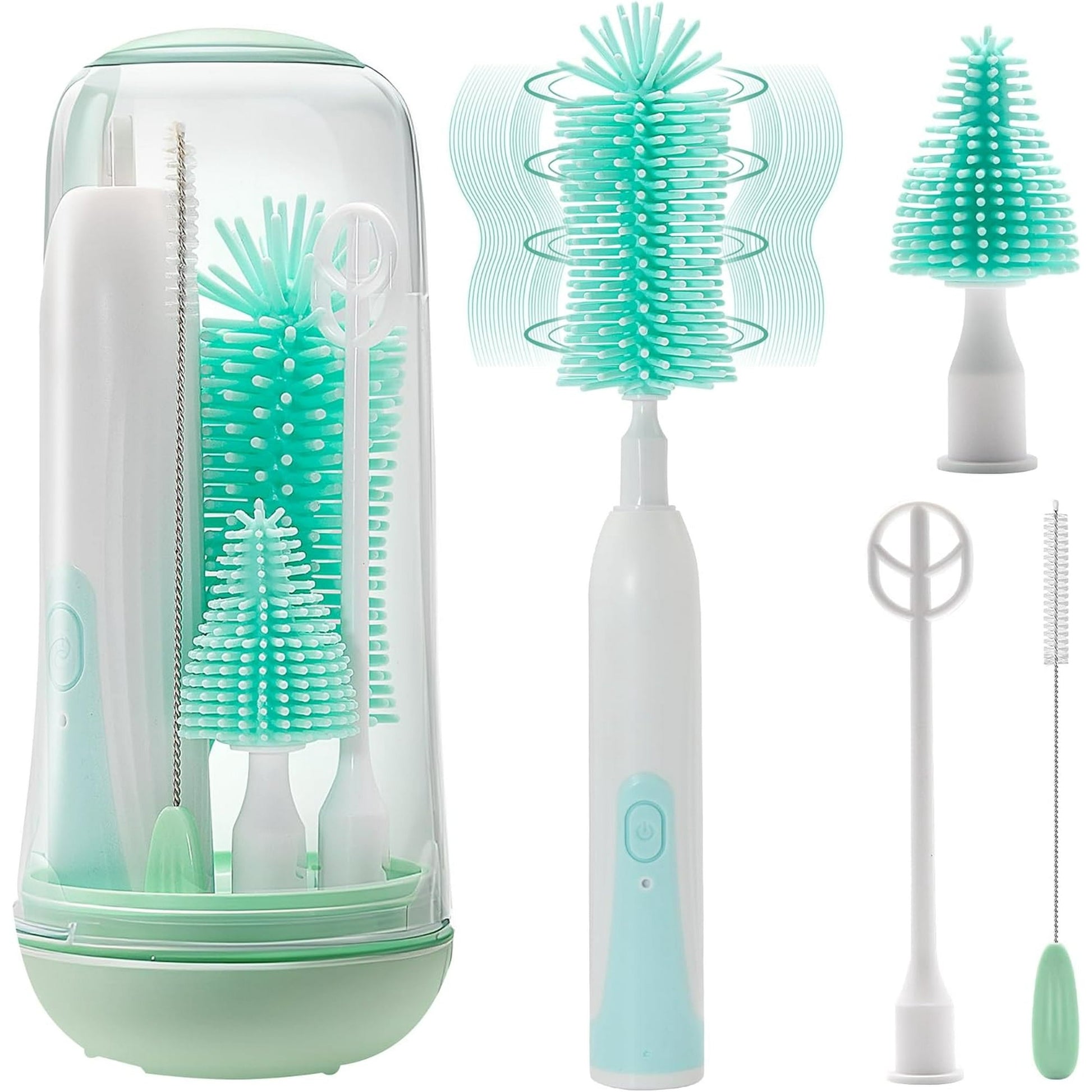 đă7-in-1 Bottle Cleaner Brush Setă: Keeps baby bottles cleaner with our 7-in-1 baby bottle brush cleaner set. This set includes electric bottle brush nipple brush straw cleaner brush milk frother drainage rack and storage box. Enough to clean various cups the powdered milk stirring head offers more convenience for new moms. With each item having its own position orderly and clean.