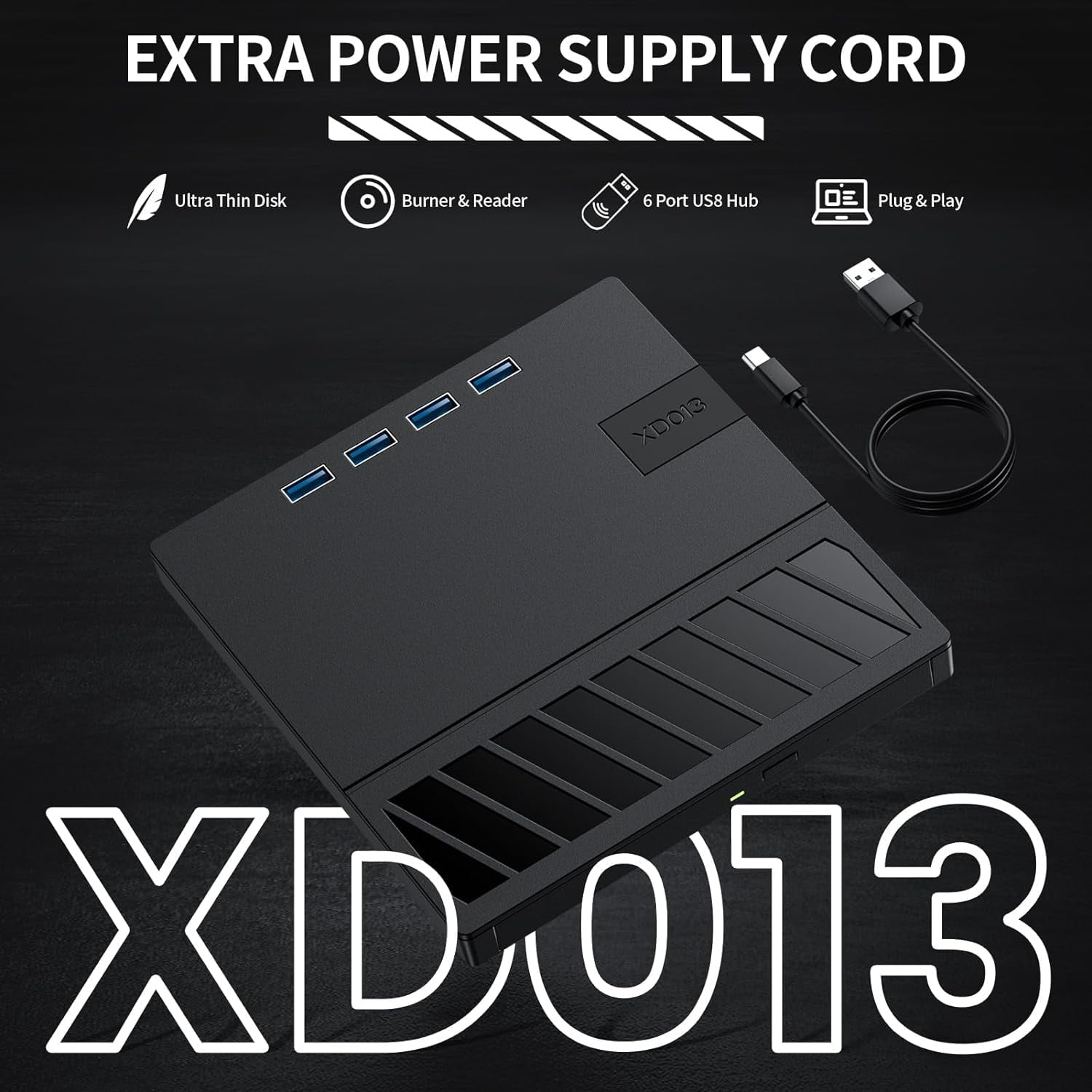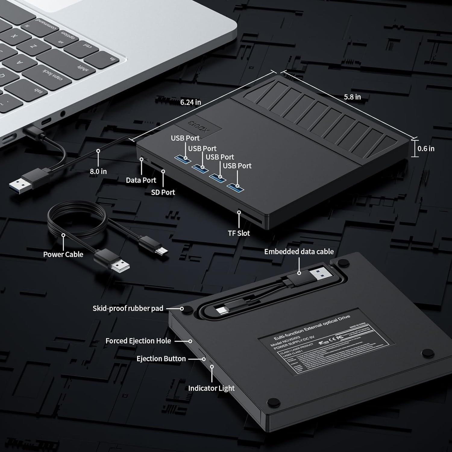 Product detailsExternal CD/DVD Drive for Laptop 7 in 1 USB Ultra-Slim Portable CD/DVD Player Burner cd writer external SD TF CD ROM Compatible with External DVD Player for Laptop MacBook Windows 11/10/8/7 LinuxDescription:Installation method Plug and Play Driver-freeData interface usb3.0+type-cProduct size 14.3CM*14.6CM*1.8CMSupport type keep burning CD/DVD/VCD/burning functionExpansion interface tf*1sd*1usb3.0*1 usb2.0*3Error correction function support error correctionInstallable system win7/win8/win10/win11 etc.Support system Mac OS/WIN98/SE/ME/2000xp/win7/win8/win1o/win11Burning speed:CD-R 24X/CD-RW 24X/dvd-r 8x / dvd+rw 6x / dvd-ram 4x / dvd-rw 24x/dvd-ram 4x / dvd-9 4xRead speed:cd-rom 24x / dvd-row 8xDVD-9 6X/DVD+RAM 4XProduct Features 1:Plug and Play : The external DVD drive is powered directly from the USB 3.0 port no additional driver is required plug it into your laptop or desktop computer and use it directly.7-in-1 optical drive : Our portable DVD player is not only a CD/DVD reader but also a CD/DVD burner/recorder 4-port USB 3.0 hub SD card reader TF card reader (SD card and TF card cannot be used at the same time).Wide Compatibility: Our USB DVD drive is compatible with Windows 11/10/8/7 Linux Mac OS and other systems. You can use this laptop external DVD drive to listen to music watch movies play games burn data and install software etc.HIGH-SPEED DATA TRANSFER : USB 3.0 up to 8x DVD read/write speeds and up to 24x CD read/write speeds providing extremely high write and read speeds.Portable DVD Player : Slim and lightweight design allows us to take it with us wherever we go and use it at home in the office or while travelling.Package Contents:1 x DVD burner1 x User's Manual1 x Extension cable