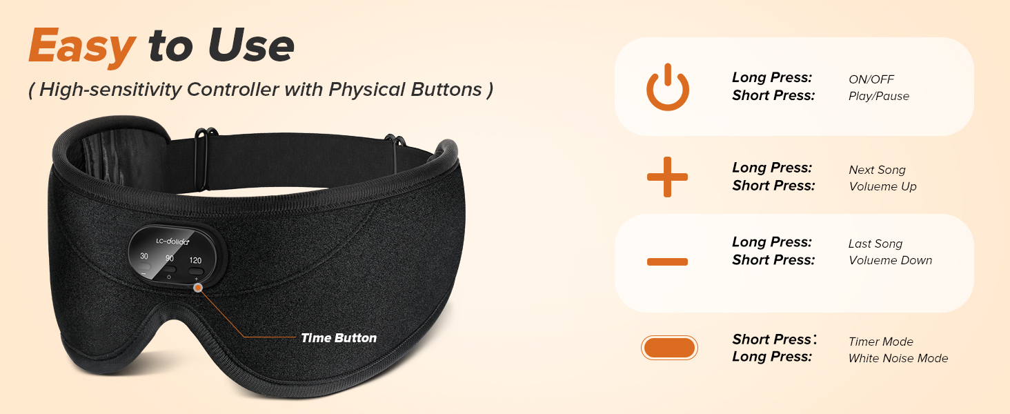 【Long-Lasting Battery Use & Timing】The Bluetooth sleep mask headset has a built-in 250mAh high-performance battery. It only takes about 2 hours to charge and can provide more than 14 hours of playback time enough to support the whole night. It can also be timed for 30-120 min to prevent Bluetooth playing music from disturbing you when you fall asleep Rest.