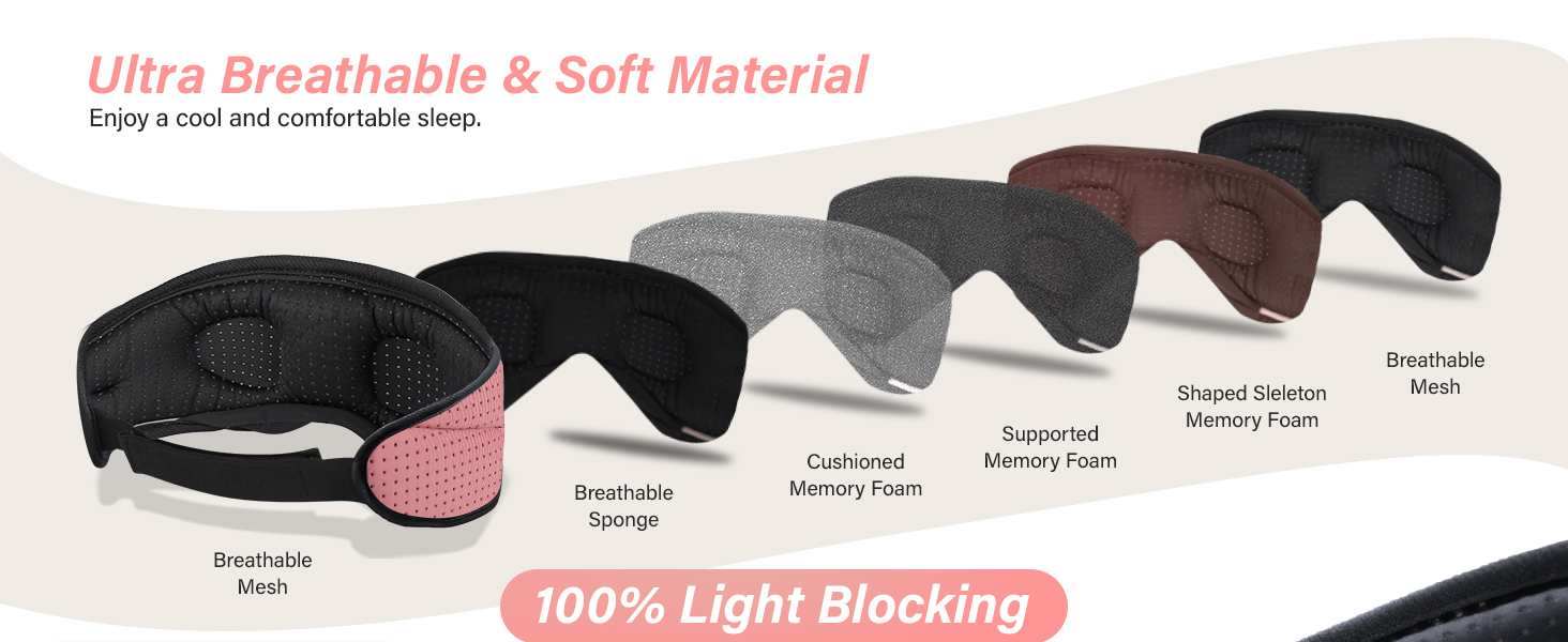 【Block Out Light Perfectly】sleeping eye mask has full coverage and uniquely designed of the nose area effectively blocking light from entering helping you to solve the problem of light disturbance when falling asleep. The upgraded 3D contoured design has a deeper contour in the eye area allowing your eyes to move freely and without any pressure.