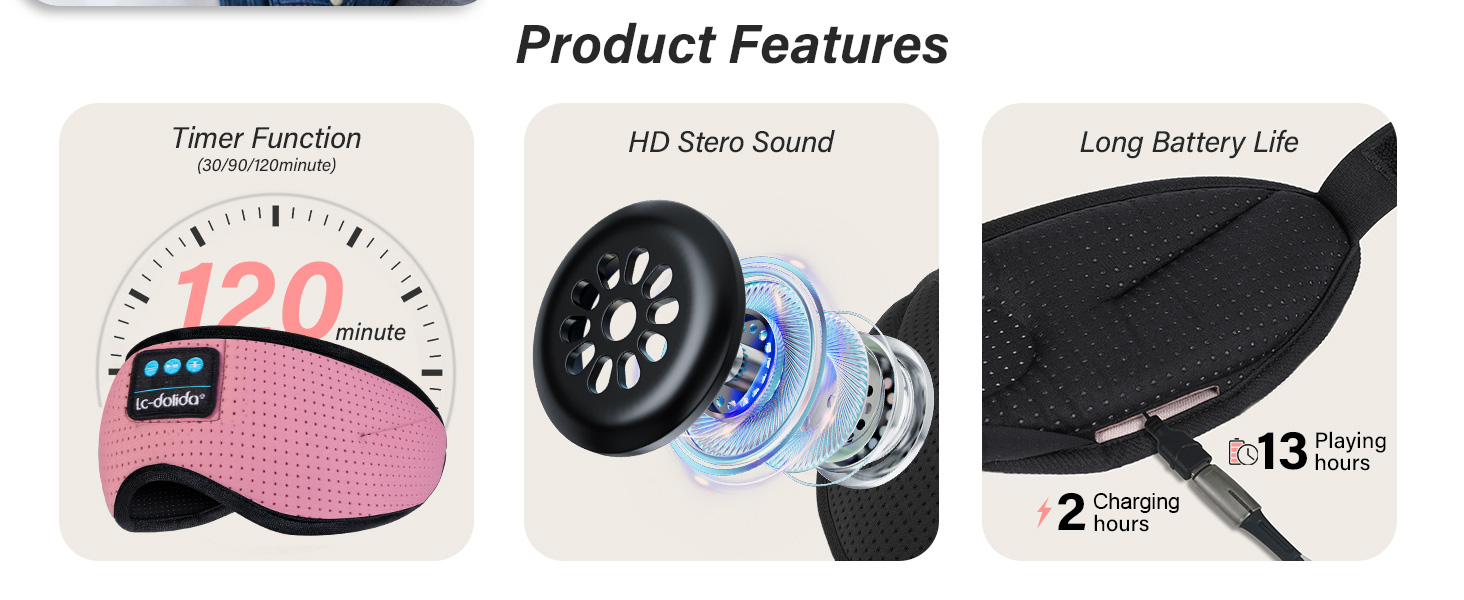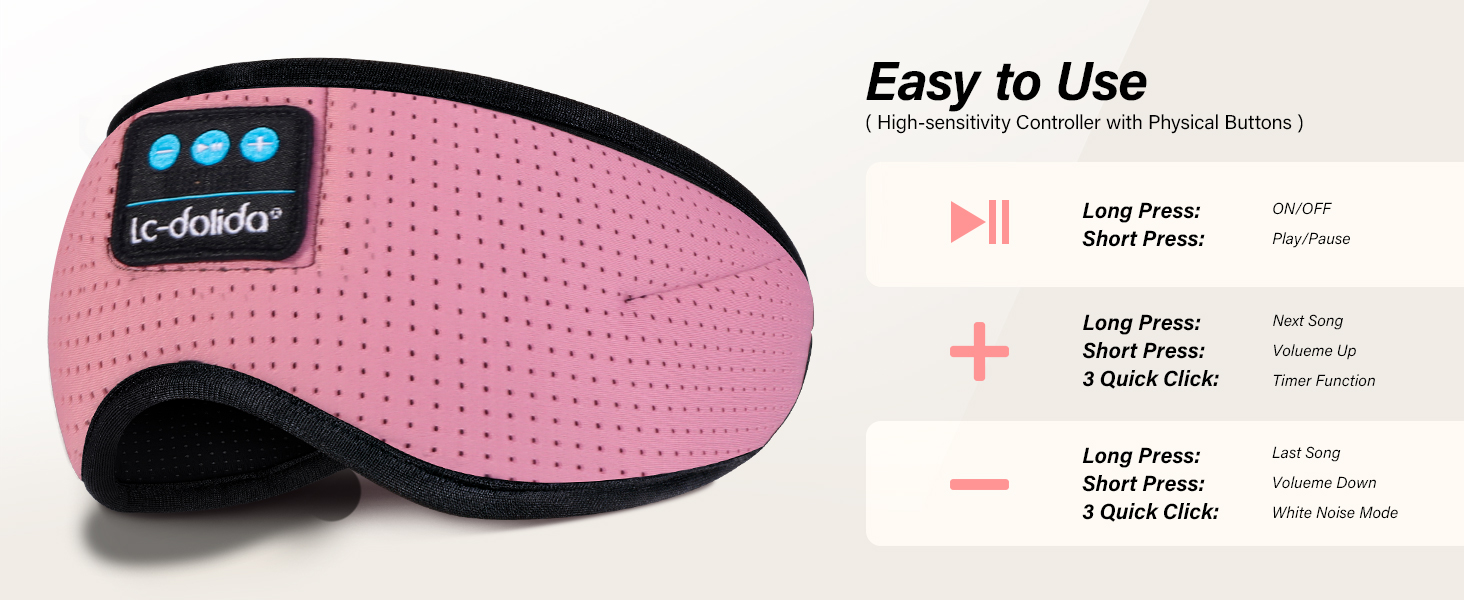 How do I switch to the natural mode (white noise mode)?Turn on the Bluetooth Sleep Mask and quickly press the "-" button 3 times to enter Natural Mode (voice prompt "Natural Mode"). Once in Natural mode you can switch to Bluetooth mode in the same way or long-press -/+ to switch between sounds.How do I get the timer to work?Tap the volume up button 3 times consecutively. It will say “30 minutes”. Do this again and it goes to 90 minutes and so on.How long does the battery last?LC-dolida sleep headphones can provide up to 12 hours of playback from a full charge.How do I connect my Bluetooth sleep mask?Please turn off all Bluetooth connect on your phone first then long press "ON/OFF" button in the sleep headphones until the red/blue light flash finally turn on Bluetooth on your phone and find the Bluetooth name " BJ21-10" then connect.How do I switch to the natural mode (white noise mode)? Turn on the Bluetooth Sleep Mask and quickly press the "-" button 3 times to enter Natural Mode (voice prompt "Natural Mode"). Once in Natural mode you can switch to Bluetooth mode in the same way or long-press -/+ to switch between sounds.How do I get the timer to work? Tap the volume up button 3 times consecutively. It will say “30 minutes”. Do this again and it goes to 90 minutes and so on.How long does the battery last? LC-dolida sleep headphones can provide up to 12 hours of playback from a full charge.How do I connect my Bluetooth sleep mask? Please turn off all Bluetooth connect on your phone first then long press "ON/OFF" button in the sleep headphones until the red/blue light flash finally turn on Bluetooth on your phone and find the Bluetooth name " BJ21-10" then connect.
