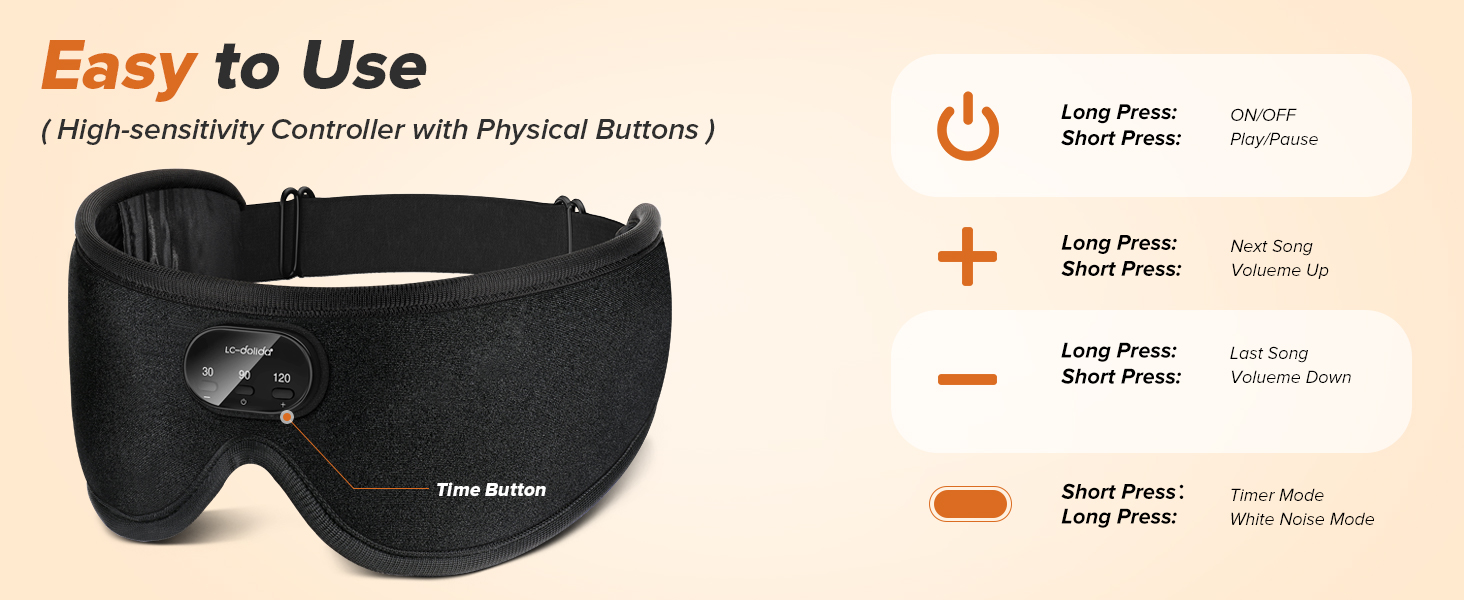 【Long-Lasting Battery Use & Timing】The Bluetooth sleep mask headset has a built-in 240mAh high-performance battery. It only takes about 2 hours to charge and can provide more than 10 hours of playback time enough to support the whole night. It can also be timed for 30-120 min to prevent Bluetooth playing music from disturbing you when you fall asleep Rest