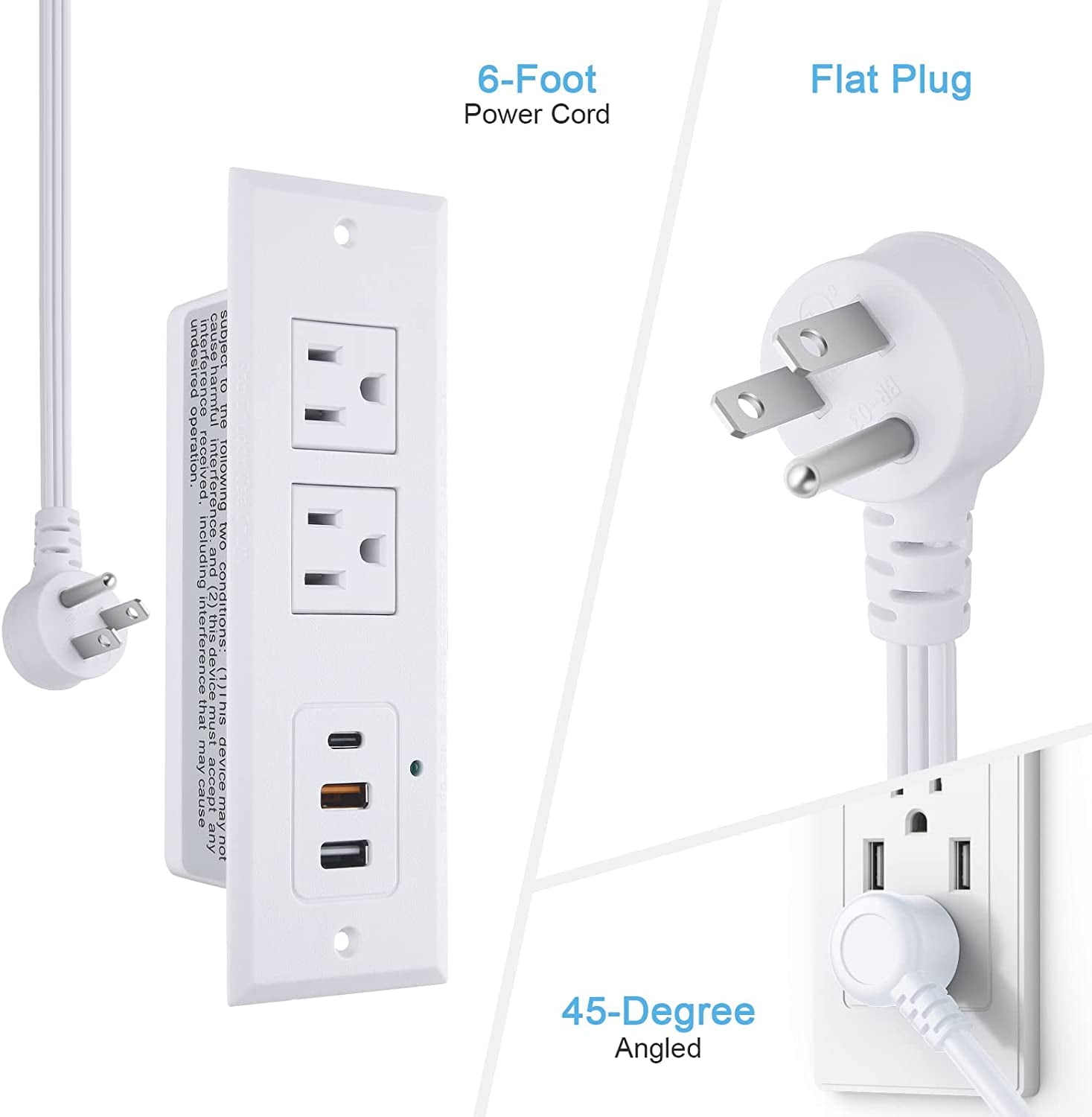 Recessed Power Strip with 20W USB C Port Fast Charging USB A Port Desk Outlet Furniture Hidden Charging Station for Side Table End Table with 6FT 45 Degree Flat Plug Extension Cord White