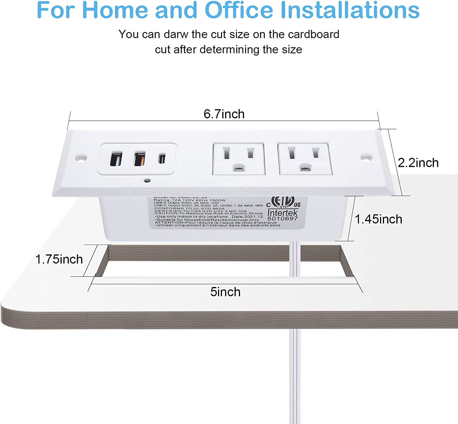 Multifunctional hidden charging station for desktop Desk hole cut size: L 4.9" * W 1.7" Need space under the table: 1.45inch. you can draw the cut size on the cardboard cut after determining the size. Come with 6 ft flat plug extension cord.