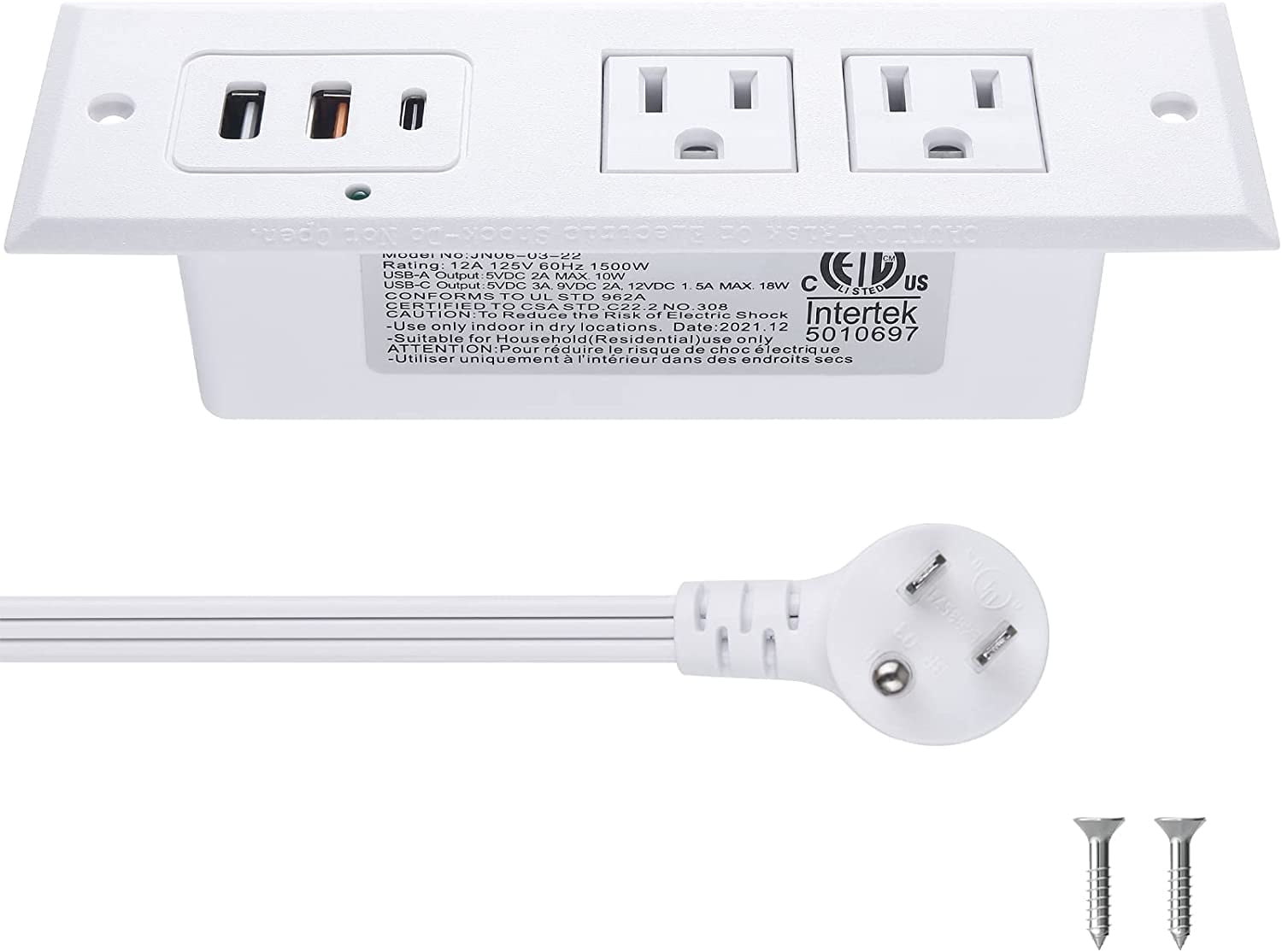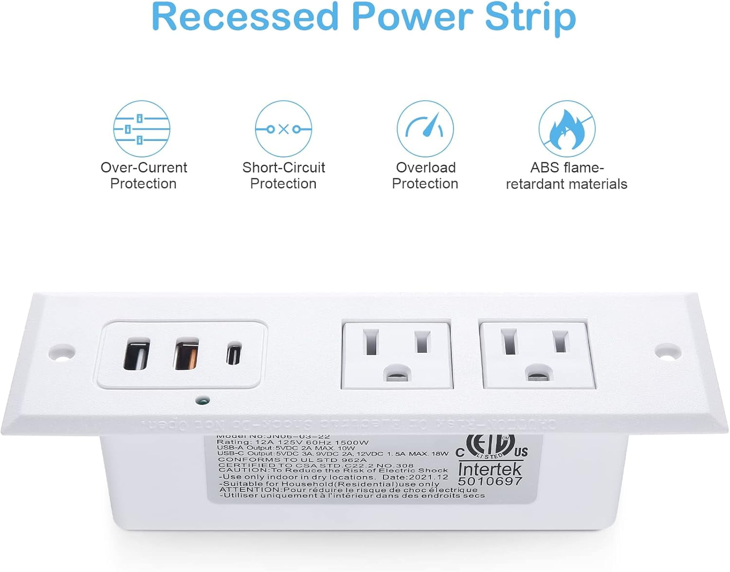 Recessed power strip with fast charging QC 3.0 18W Max USB-A port and PD 3.0 20W Max USB-C port. Come with another ordinary smart USB port 2 standard US sockets. Great addition to nightstand or furniture table.