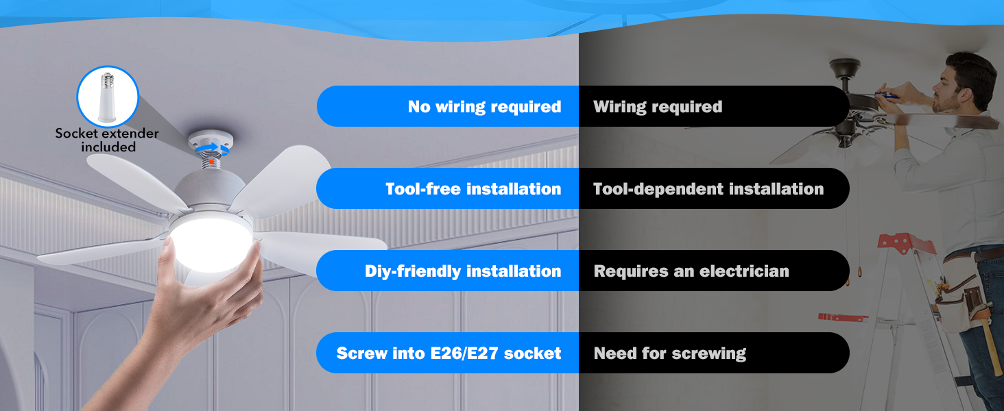๐๐๐ฌ๐ฌ๐ฅ๐-๐ ๐ซ๐๐ ๐๐ง๐ฌ๐ญ๐๐ฅ๐ฅ๐๐ญ๐ข๐จ๐ง: LC-dolida socket fan has a diameter of 20 inches and weighs 1.9 pounds. The fan blades can be easily inserted into place making it convenient for installation and disassembly. Additionally it features a universal E26/E27/B22 screw base and comes with a socket extender making it compatible with most light bulb sockets. The installation process is as simple as screwing in a light bulb requiring no tools or electrician