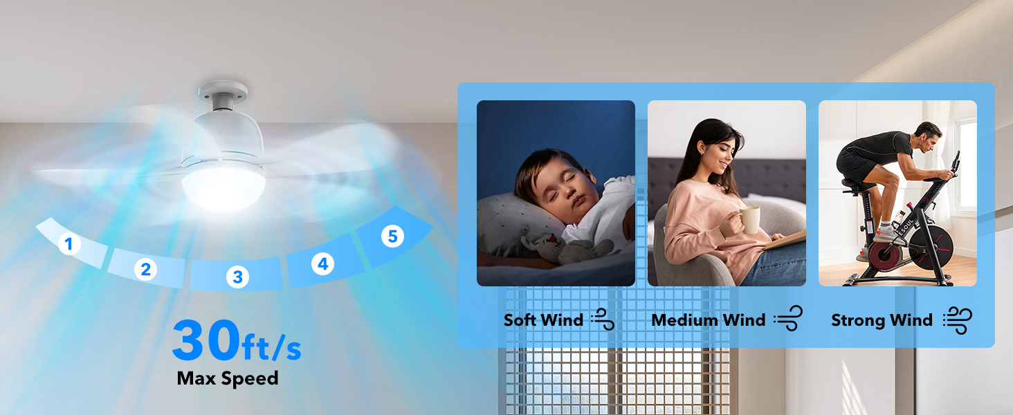 ๐๐จ๐ฐ๐๐ซ๐๐ฎ๐ฅ ๐๐ข๐ซ๐๐ฅ๐จ๐ฐ ๐๐๐๐๐๐๐ฎ๐ฅ ๐๐ฑ๐ฉ๐๐ซ๐ข๐๐ง๐๐: Our socket fan light features an advanced vibration reduction and noise reduction technology in its built-in motor providing not only powerful airflow but also effectively reducing vibration and noise. It offers 5 different speed settings with a maximum speed of 30ft/s to meet your various needs. With the support of advanced technology it operates at a low noise level of only 35dB ensuring a peaceful sleeping environment for your family