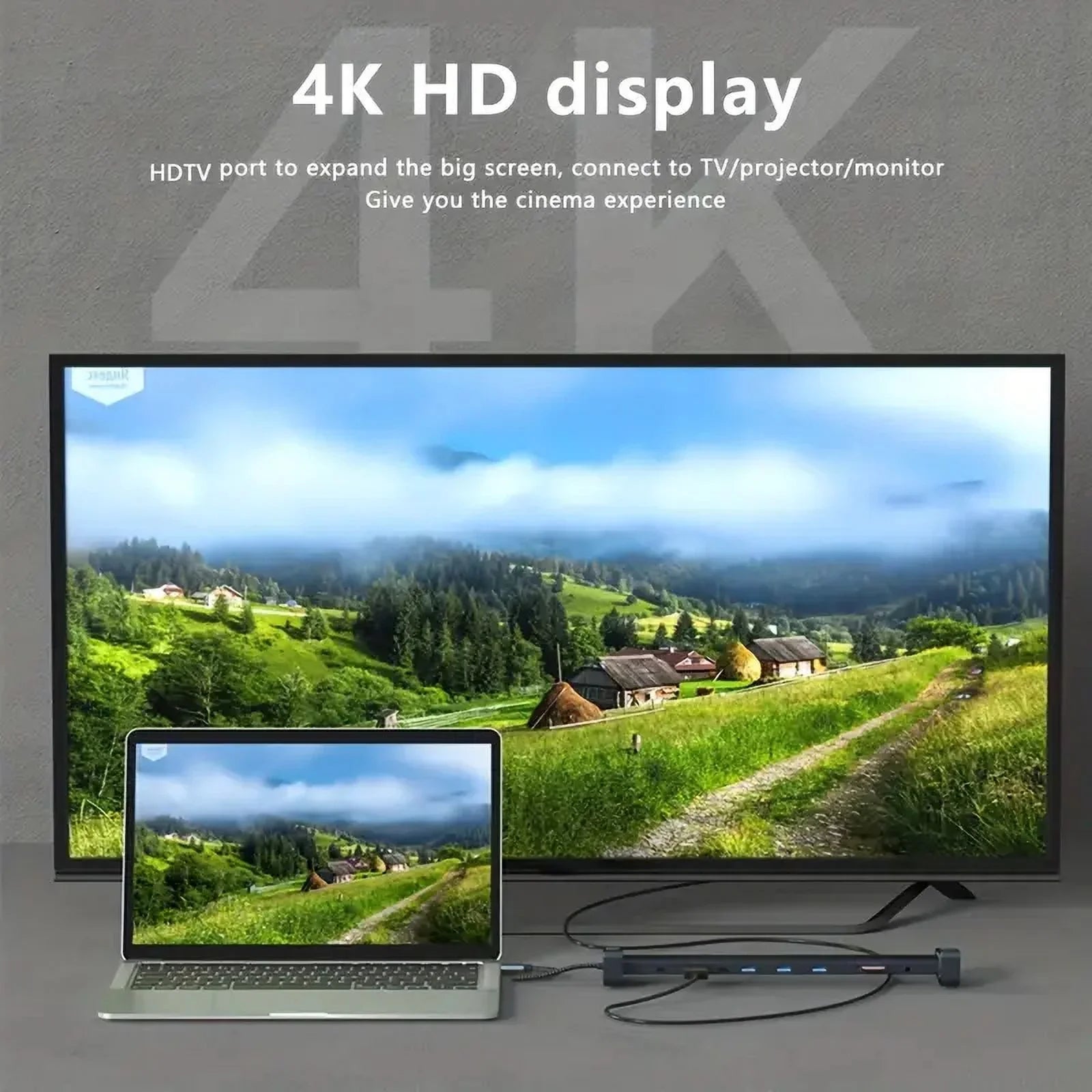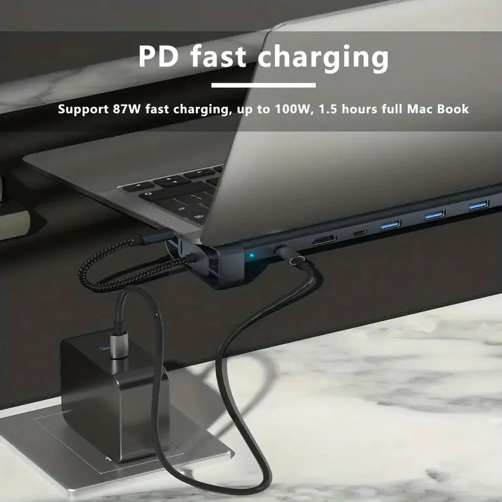 Package Includes: 1 x USB C Laptop Docking Station StandDescription:【10 IN 1 Laptop Docking Station】USB C multiport hub equips with USB C PD port (only charging) Gigabit RJ45 port 4K capable HDMI ports SD/TF card slot Audio slot 3 x USB 3. 0 Ports and stand. With a simple plug and play connectivity This USB C hub turns any MacBook or USB C capable PC laptop into a mobile workstation!【Auto-Adjusting Ethernet Port】 USB C Docking Station with 1000Mbps Ethernet port perfect standby for laptops without Ethernet sockets when wireless network fails. The RJ45 port can recognize your internet speed and automatically adjusts to the highest level no matter it is 10/100/1000Mbps.【Fast Power Delivery】Multiport USB C adapter provides one Type-C pass through Female port by which you could securely charge connected MacBook or other Type-C laptops. Support 100W power in; Power out (charging) is limited to 87W for safety. Please connect 65W or more power to ensure sufficient power to work.【Reliable Data Syncing Transfer】Dual Monitor Adapter have 2 USB 3.0 ports supporting transmission speed rates up to 5 Gbps and one USB2.0 compatible with more data devices. Built in SD and TF slots for easy access to files from universal SD and Micro SD Memory Card support 2 cards reading simultaneously.